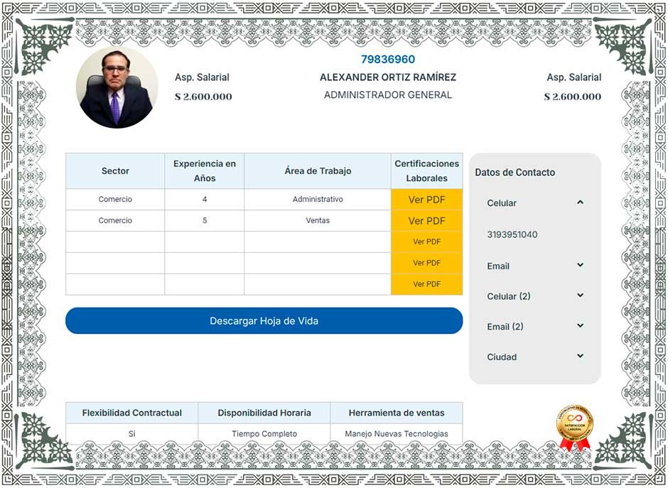 1.1.14 DOCUMENTO: Contiene la información profesional y confidencial del publicante. Únicamente visible para los clientes que adquieran alguno de los planes de acceso ofrecidos por nuestra empresa.