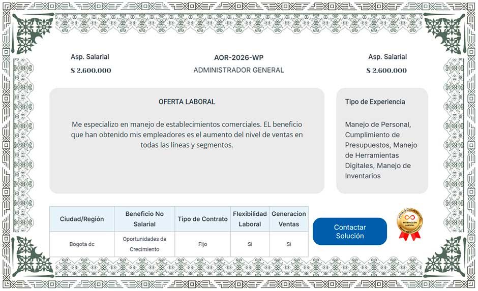 1.1.6 OFERTA LABORAL: Propuesta de servicio especializado que sustenta la aspiración salarial y otros intereses económicos del suscriptor.